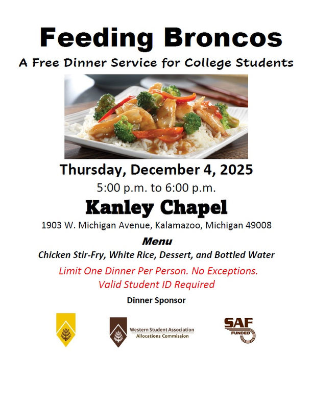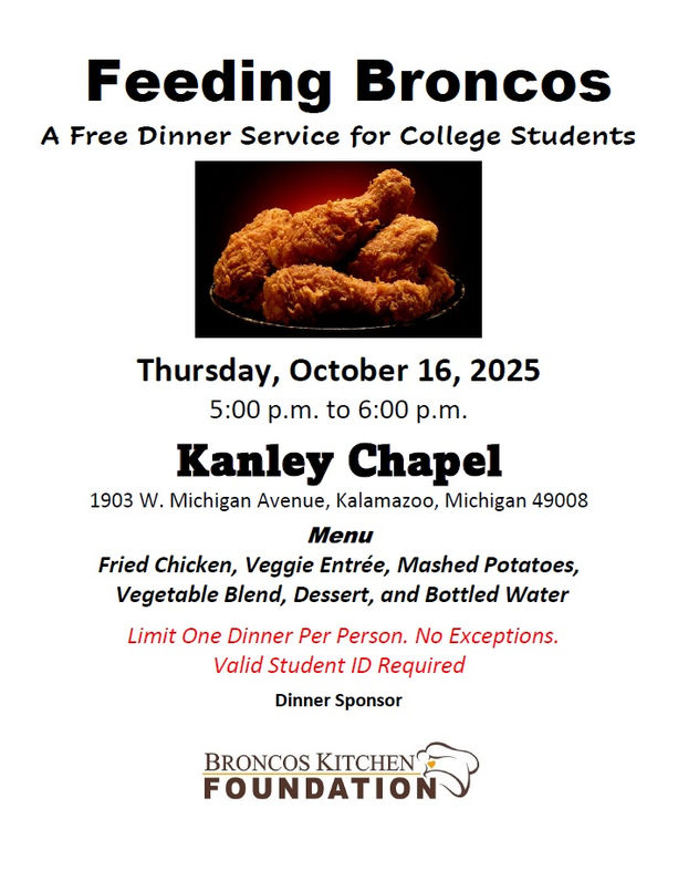 Broncos Kitchen's FREE dinner service is open to all Kalamazoo area college students, provided you have a valid ID. Meals are served from 5 to 6 pm on Mondays and Thursdays on a first-come, first-served basis. Sorry, we do not serve seconds.